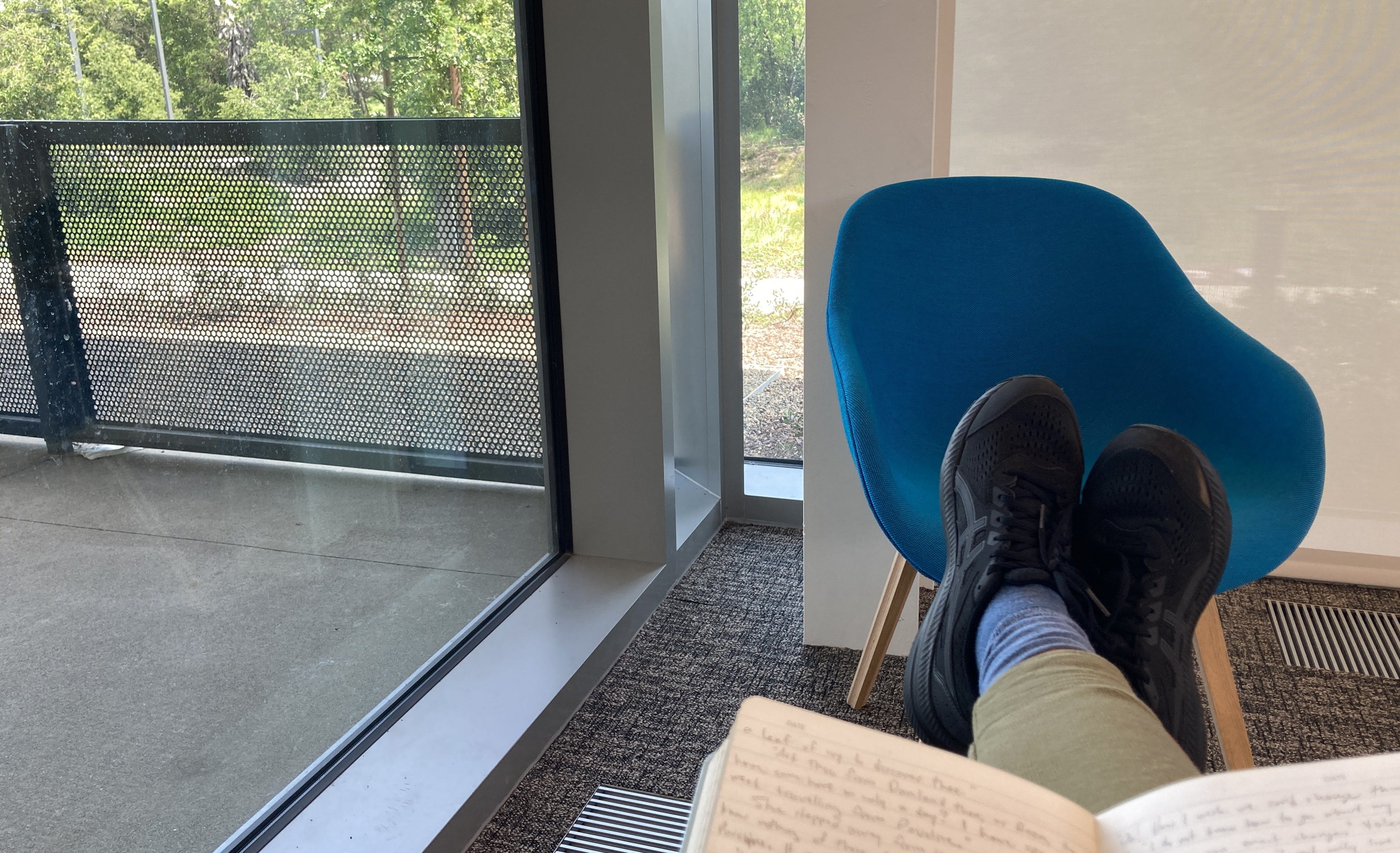 Before me there are trees with leaves all different hues. There is so much green, and hints of brown, red, and yellow, with blue among the bush. A blanket of clouds calms the day and allows the shades to be drawn up, revealing the full view even this early in the day when otherwise the sun would be too blindingly bright. I sit in the corner of my library, a three-quarter thrust of windows around me instead of walls. The temperature within is a perfectly comfortable sort of cool refreshing warmth, and the whole place smells of sweet cleanliness and old books.